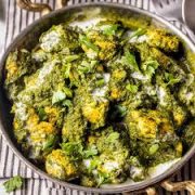 Chicken simmered in a spicy sauce made of spinach leaves and spices.